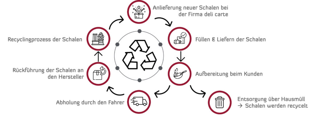In der Vergangenheit haben wir bereits mit unserem Lieferanten der Mehrportionsschalen einen geschlossenen Wertstoffkreislauf geschaffen. Interessierte Kunden können Ihre benutzen und gesäuberten Mehrportionsschalen unseren Fahrern aushändigen. Diese werden dann gesammelt und an den Hersteller zurückgeführt, welcher die Schalen dann recycelt und wiederverwertet. Über den Hausmüll entsorgte Mehrportionsschalen wurden dabei in diesem Prozess nicht berücksichtigt.